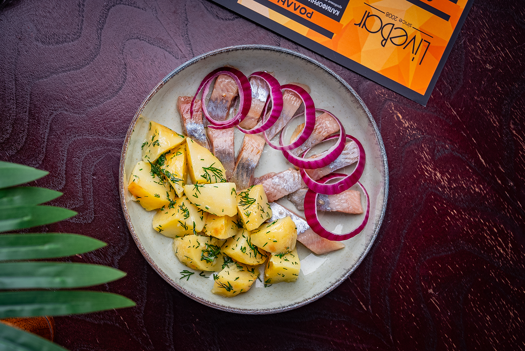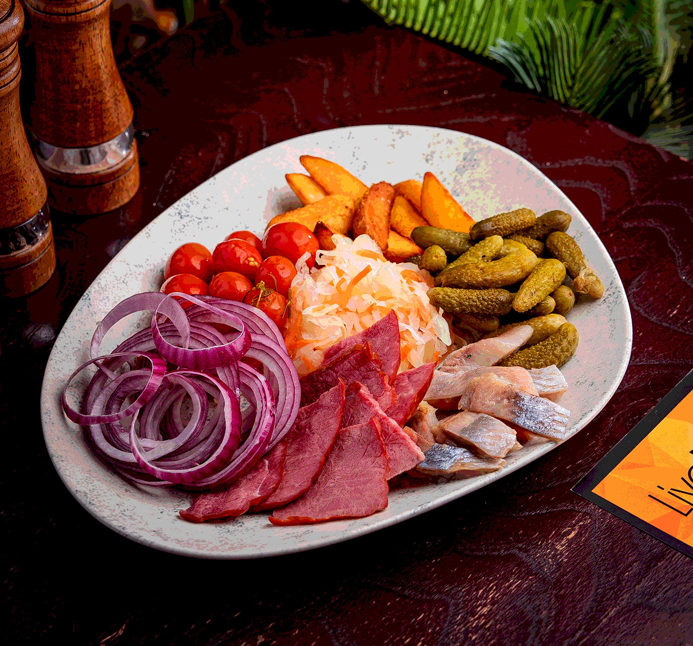 Сельдь, Телятина копченая, Капуста, Картошечка, Черри, Корнишоны
